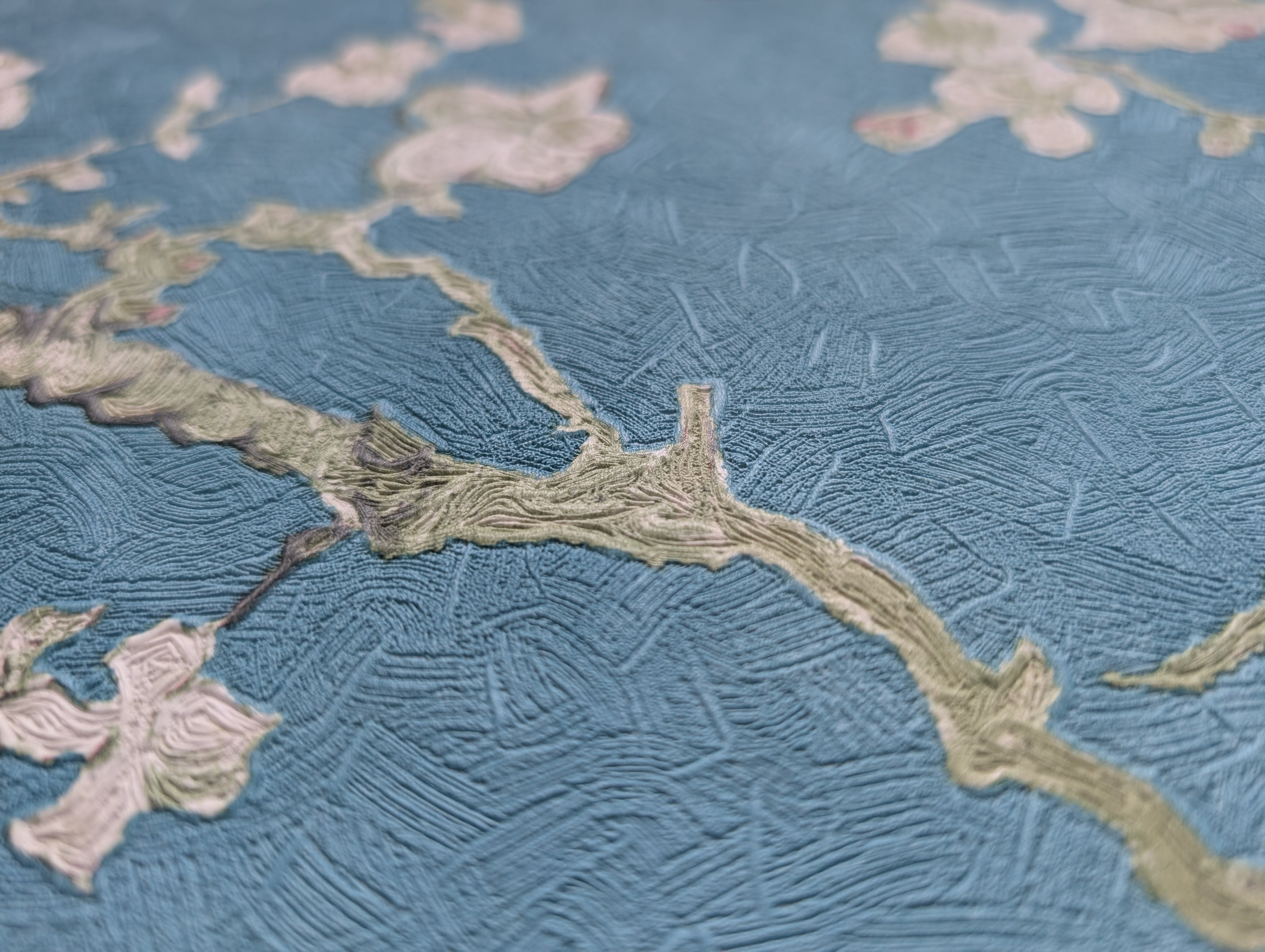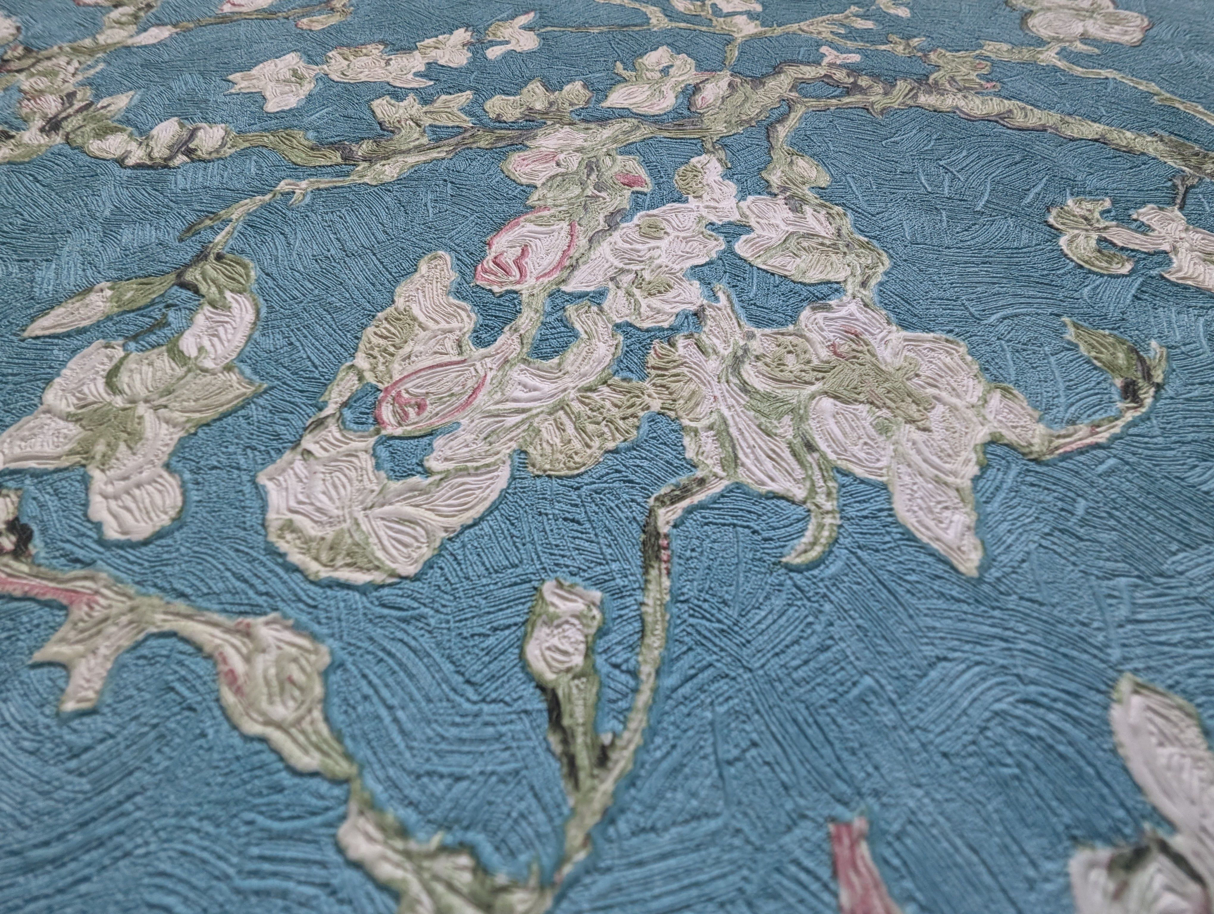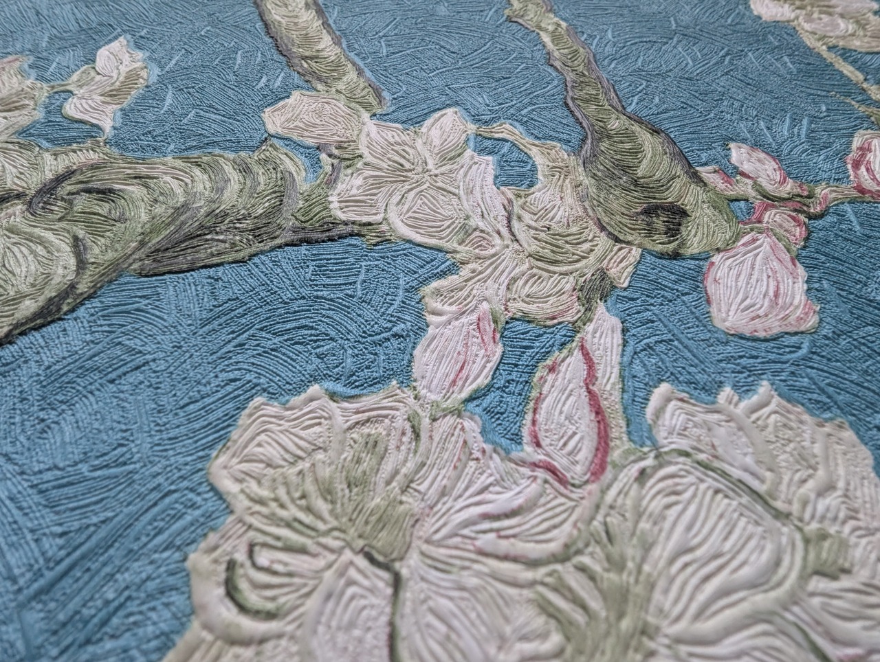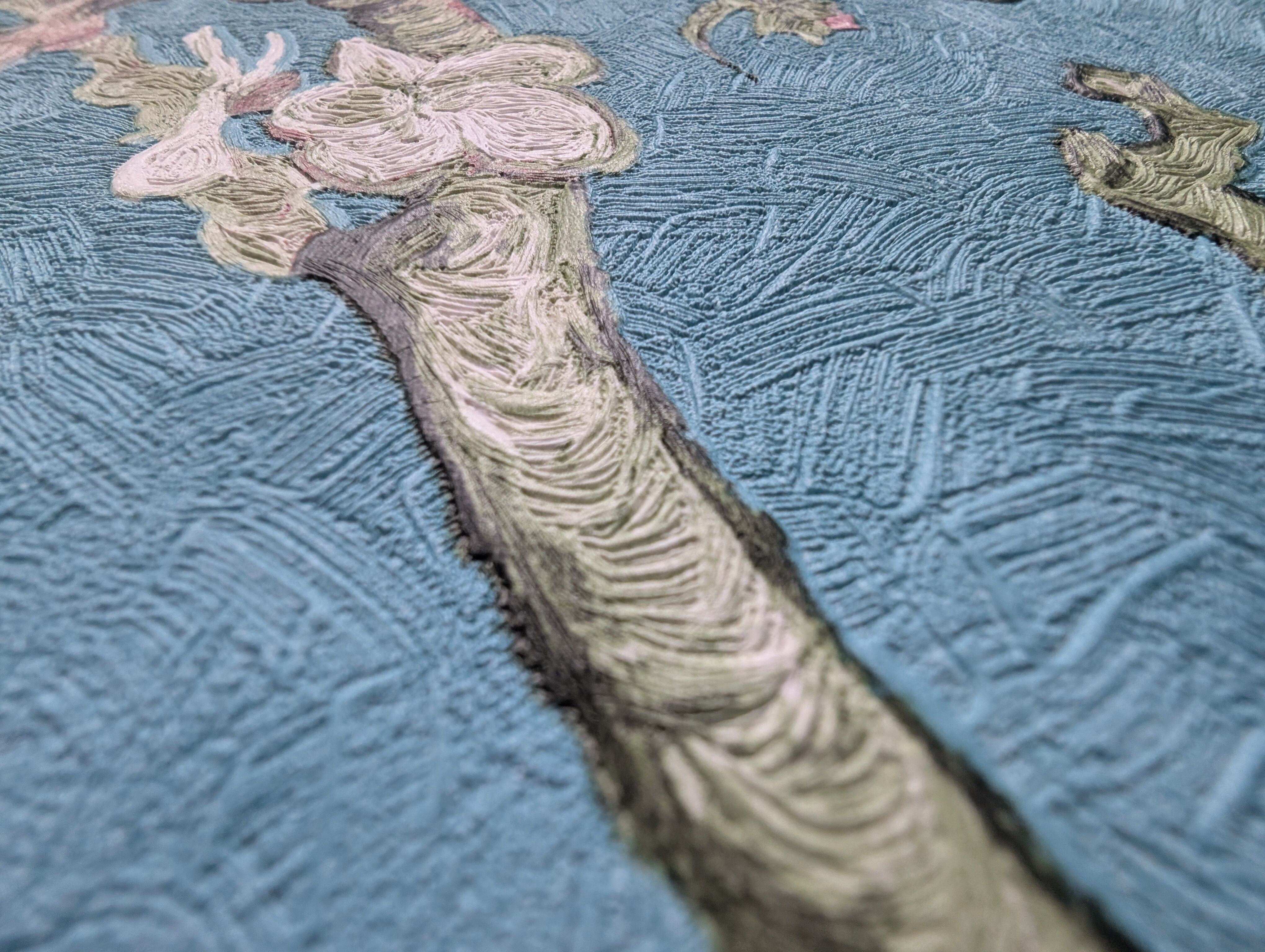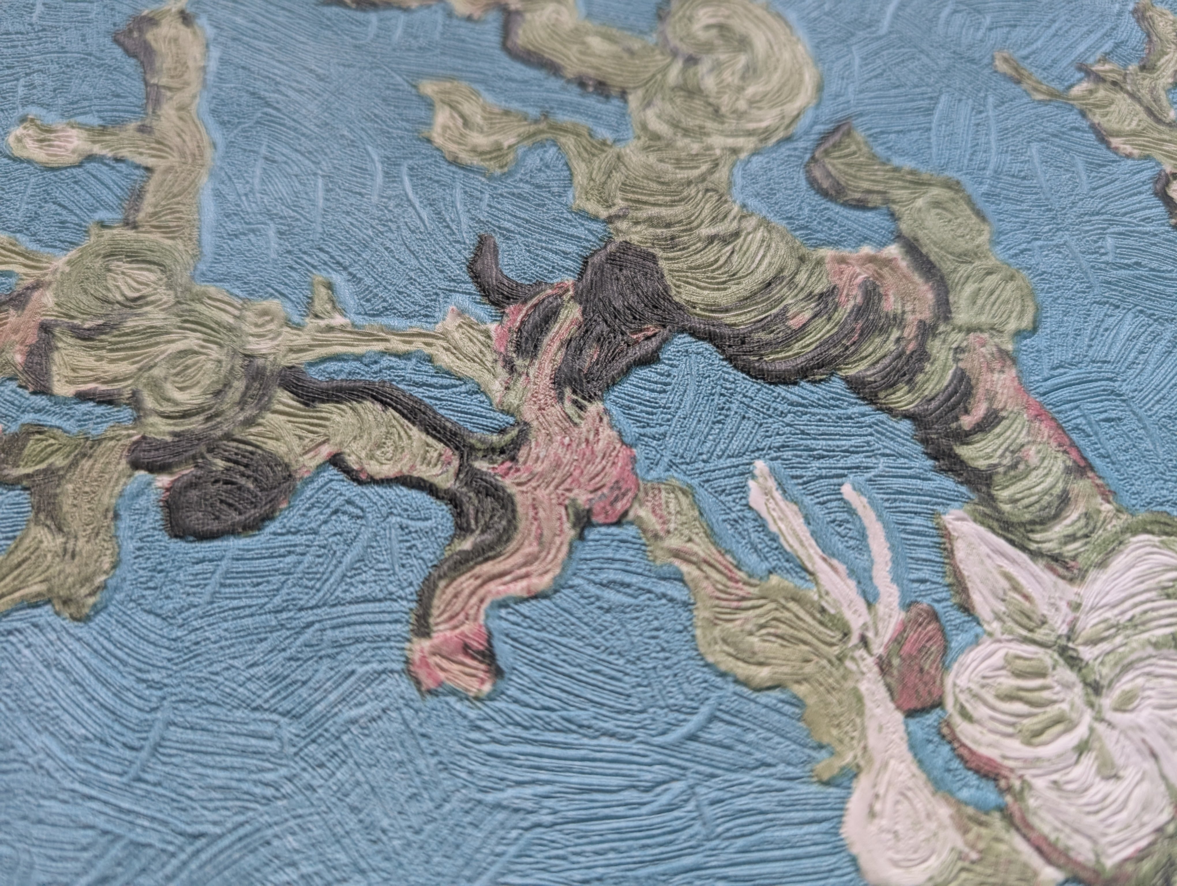 ゴッホの「花咲くアーモンドの木の枝」をベースに、本物の絵画を忠実に再現した色使いや、ゴッホ特有の力強い筆あとがエンボス加工と印刷でリアルに表現されています。